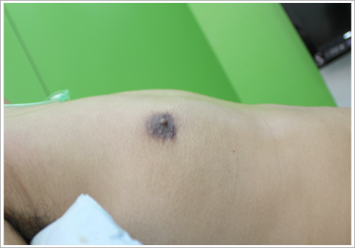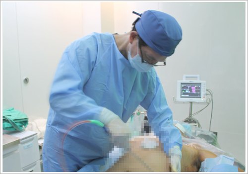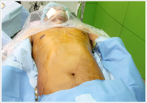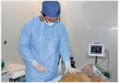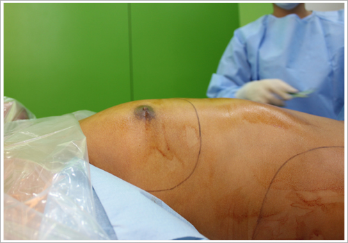 ▲首先進行雷射溶脂,消除皮下隆起的脂肪及破壞乳腺。
