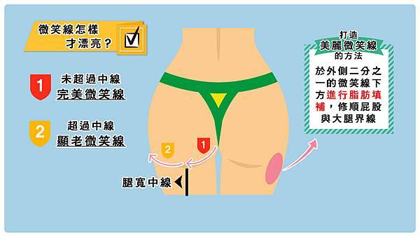 把屁股的凹陷跟大腿的界線補平了,這樣從屁股順下去,一直到大腿的外側,就是一個漂亮的微笑線。